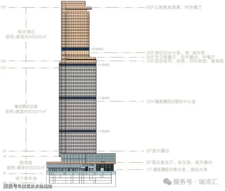 项目总占地约7700㎡,建筑面积约10.7万㎡,其中包含了约4万㎡瑞吉酒店、6.2万㎡企业会馆瑞湾府以及5000㎡瑞湾荟商业,是一个集企业会馆、五星级奢华酒店、精致商业于一体的垂直综合体。