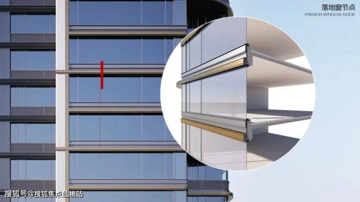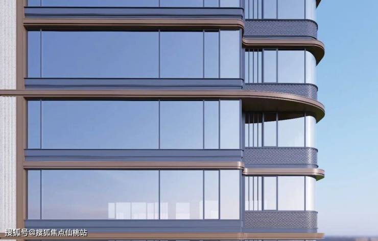 =二层以上则全覆盖高定铝板与超大面玻璃,建筑主体每层以30cm宽香槟金铝板横向覆盖,转角处采用圆角收边工艺,消解冷峻棱角。竖向则以米通高的米白色波浪仿石铝板,勾勒立面骨架,形成独特而统一的美学语汇。飘窗外侧覆盖定制花状穿孔铝板,以金属线条精致收边,细节之处,皆见匠心。