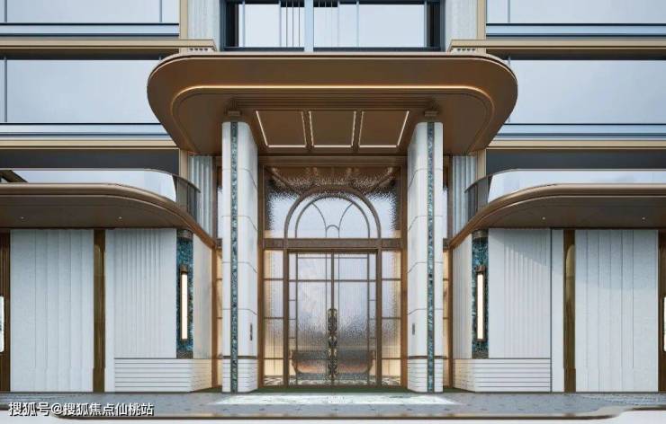 =以福州古厝飞檐为灵感,融合东方美学与现代工艺,打造8.1米高,3.6米深挑檐的单元门庭,门楣亮子延续拱形元素,横楣以蚀刻工艺点缀“紫阳”标识,门框则饰以黄古铜拉丝装饰线脚。门厅拉手镶嵌定制的景泰蓝奢石,触感温润如玉。
