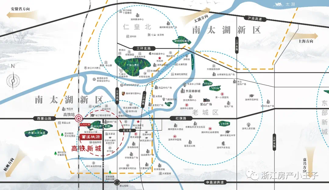 【交通配套】:临近湖州高铁站(沪苏湖线路在建中,规划湖嘉城际铁路),沪苏湖高铁建成后可实现四站苏州,六站上海虹桥,完成与周边主要城市“一小时交通圈”建设。风尚出行,畅达长三角各地,将成为现实。【商业配套】:农贸市场(规划)、海王康山小镇(在建)、华悦商业广场、蓝城星悦广场(在建)、浙北超市南太湖店等,共筑便捷都市生活。【医疗配套】:板块内医疗资源充足,南太湖医院(三甲医院),太湖明德医院等,为家人健康保驾护航。【教育配套】:近邻帕丁顿国际学校、华东师范大学湖州附属实验中学(在建),人文书香氛围浓郁。