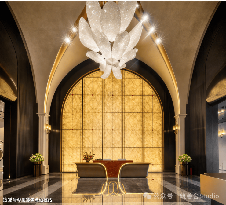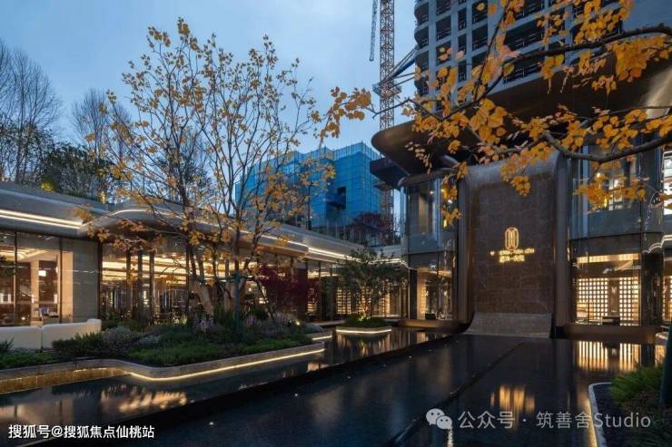 约1000平方米下沉式庭院,灵感源自“湘江之水天上来”,水流自高处引入,约11.8米跌水瀑布与细幕倾泻,尽显精工美学与磅礴气势。中央镜面水景如琉璃铺展,将天光云影与建筑轮廓尽收其中。鎏金水瀑、奢石卡座与珍贵绿植疏影交织,室内外景致无界渗透,一步一停皆染诗韵。
