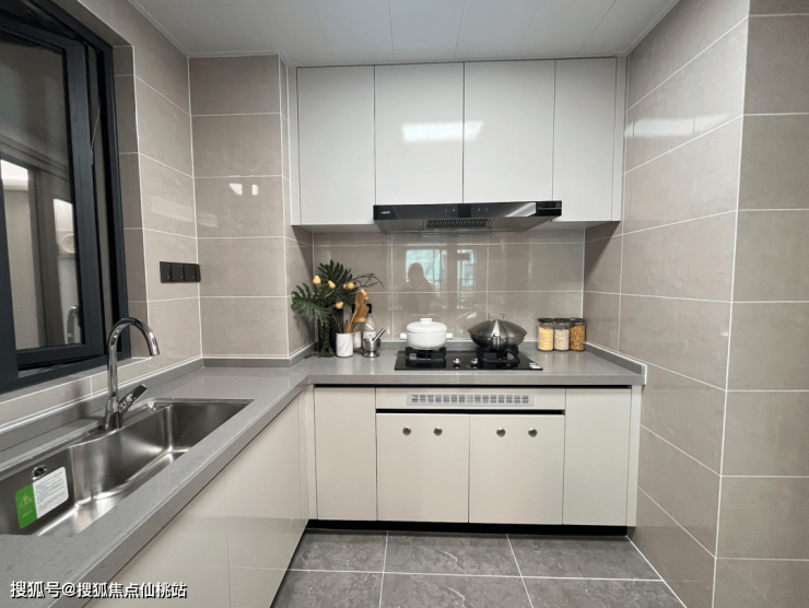 L型的厨房则采用了主妇最爱的大单盆、升级加配品牌吊柜,无论你有多少厨房工具,都能完美收纳。