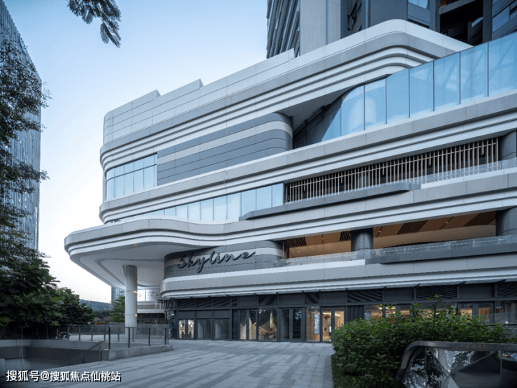 保利天际底层裙楼充分地敞开于户外,根据功能的需求使模仿自然沟壑的横向肌理外凸形成入口雨棚,内退形成休闲平台,从而形成丰富的立面形态,带来层叠的视觉观感和无遮挡的视觉体验。