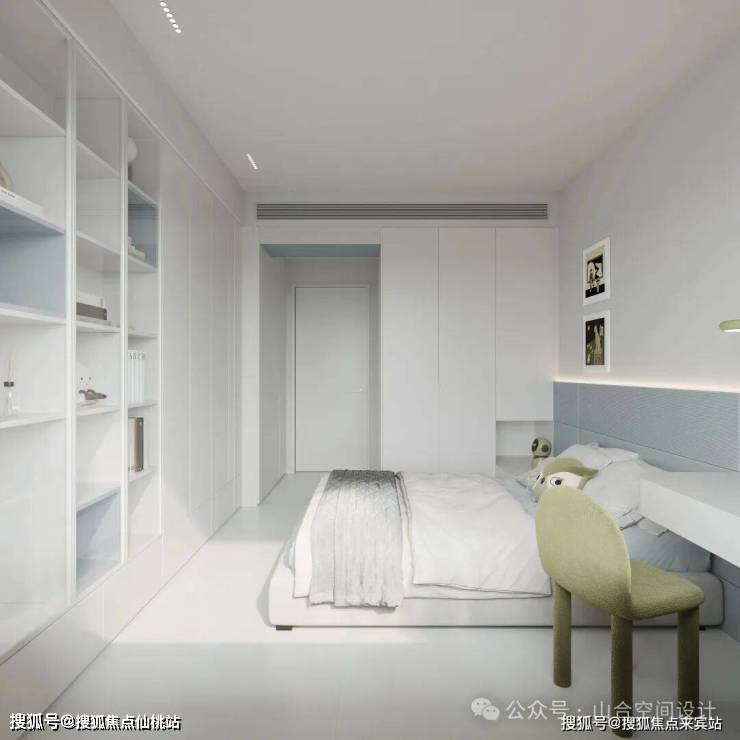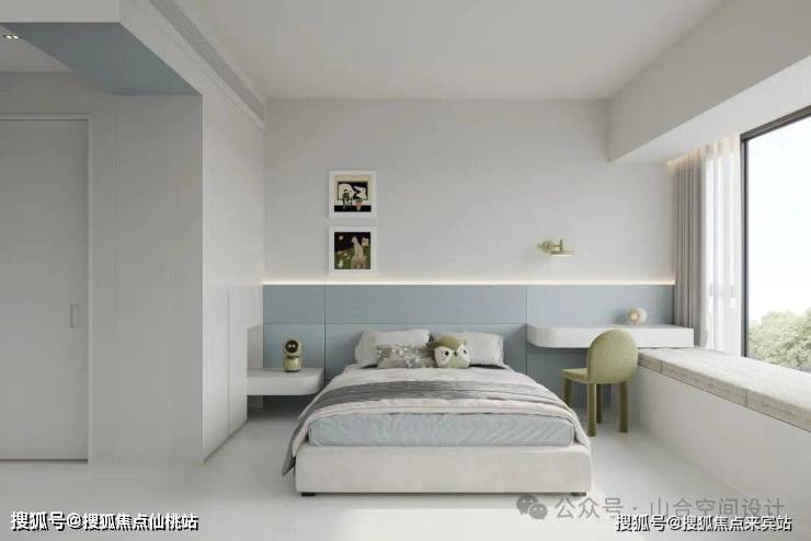 儿童房区域采用浅灰与柔蓝为基调,床具线条简约柔和,猫头鹰抱枕、机器人摆件为空间注入天真趣味;墙面的插画作品如童话绘本,在灯光映衬下诉说着想象的故事。一体化书桌与飘窗设计,让学习与休憩自然衔接,草绿色座椅则为空间点亮一抹活力生机。