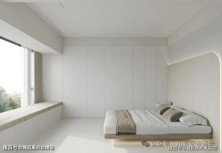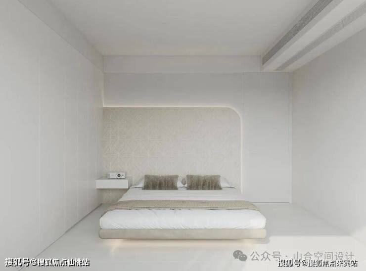 主卧区域床头的几何纹理背景墙是点睛之笔,细腻的线条在素白中交织出艺术肌理,弧形边缘的柔和设计打破了直线的冷硬,为空间增添了一份温柔的叙事感。一侧的极简床头柜与嵌入式投影设备,让休憩时光既能享受纯粹的静谧,也能随时开启光影的浪漫。