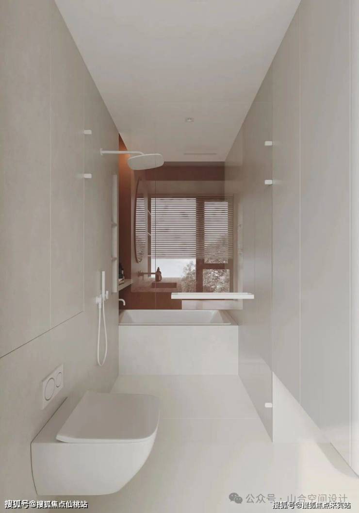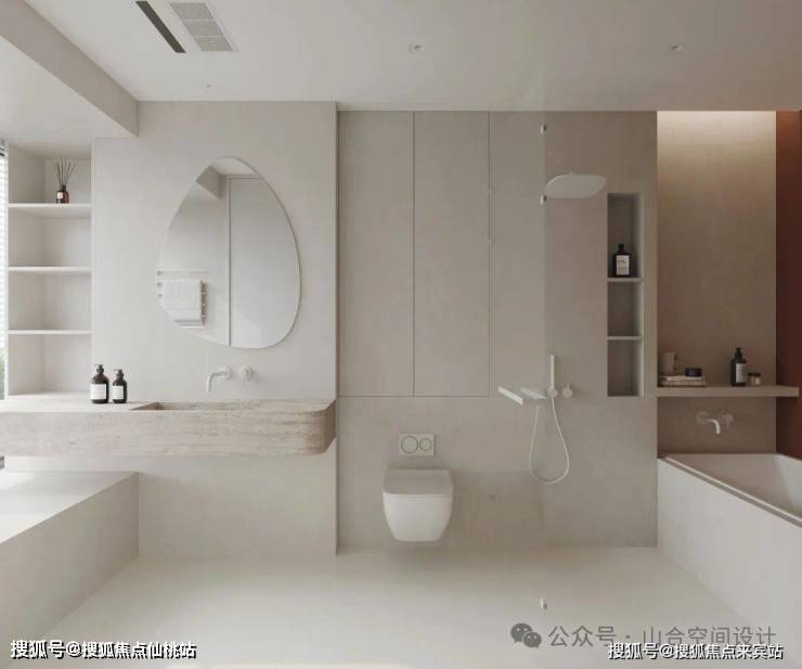 主卫区域洗手台的天然洞石台面是视觉核心,粗糙的纹理与温润的色泽,在极简线条中显露出自然的诗意;水滴形镜子打破常规几何的刻板,为空间注入一丝灵动。