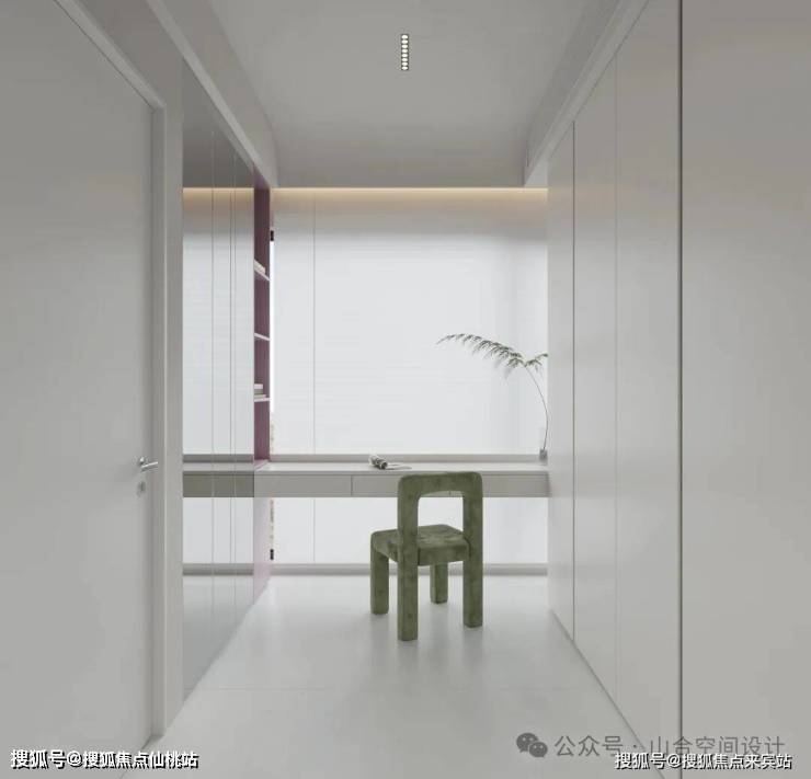 衣帽间区域采用一体化的白色书桌沿着墙面延展,与通顶柜体浑然天成,悄然隐匿了收纳的琐碎。一抹绛紫的置物架如艺术笔触,为空间注入灵动的色彩张力;那把苔藓绿的绒面座椅,以几何感的利落线条,成为视觉焦点,柔化了极简的冷调,更添一份轻奢的质感。