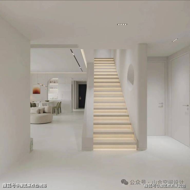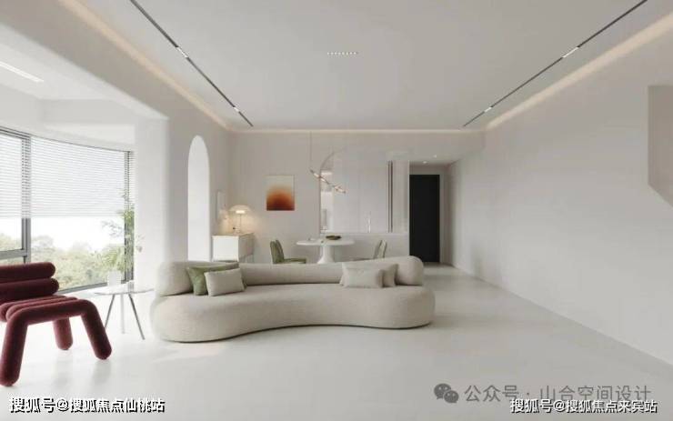 客厅区域以白色为主调,弧形沙发如云朵般柔软,打破直线的单调,与酒红色异形椅形成材质与色彩的对话,在纯白天地中勾勒出灵动的视觉焦点。大面积落地窗引入自然天光,百叶帘轻拢间,将室外绿意化作室内的温柔背景。