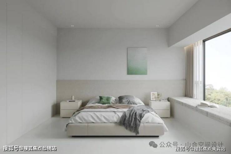 次卧区域采用悬浮式床搭配深浅交织的床品与毛毯,在纯粹色调中晕染出层次暖意。 嵌入式衣柜隐于墙间,消解了空间的压迫感;两侧床头柜简约雅致,其上的艺术摆件与绿植画作为空间注入灵动感。