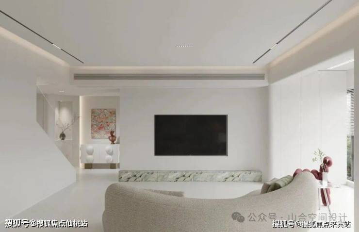 电视墙的利落留白与下方大理石地台的自然肌理碰撞,勾勒出理性与自然的对话。
