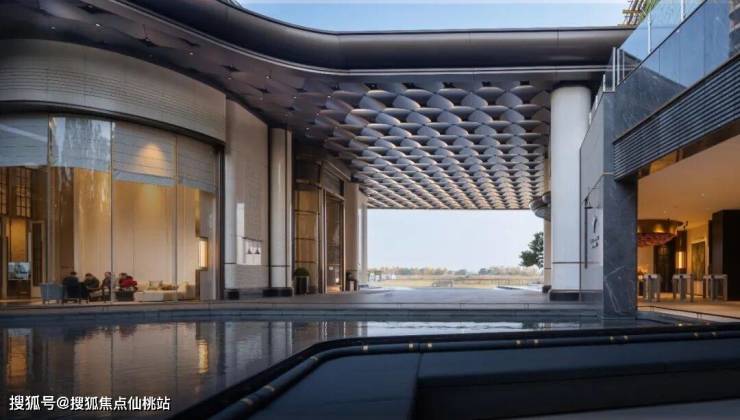门庭檐宇以凌云之姿傲然挺括,如一幅次第铺展的东方长卷,藏尽礼制风华。宽逾20米、高近9米的敞开式门洞,以通透包容之态,启幕归家礼序的第一篇章。门内,归心园林藏境,静谧自成天地;门外,市井烟火萦绕,繁华触手可及。一内一外之间,界定了尘嚣与静谧的分野,呈现“出则繁华,入则山林”的东方栖居愿景。