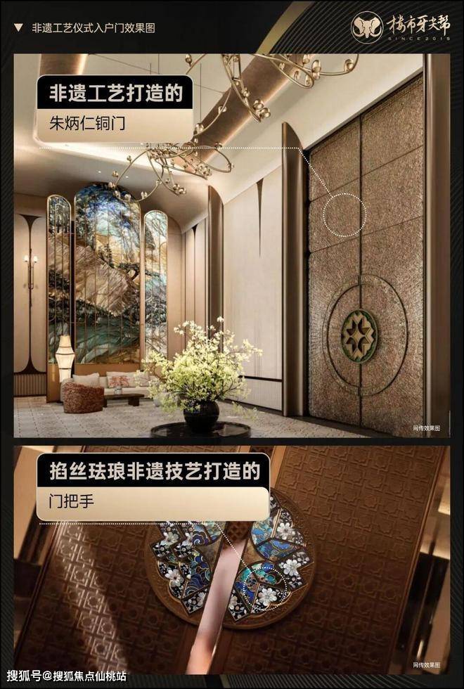为符合金沙文脉气质,打造隐奢居住社区,保利专门邀请了国家级非物质文化遗产传承人朱炳仁老师,用非遗铜雕技艺,打造了重达一吨的仪式入户门。没错,就是那个给雷峰塔“穿”铜衣、打造灵隐铜殿、参与打造峨眉山金顶铜殿的国宝级大师。