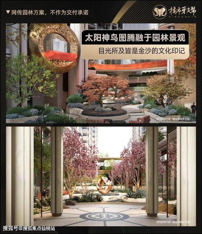 再看园林和建筑设计,保利更是把金沙文化玩出了新高度!太阳神鸟图腾融于园林景观,目光所及皆是金沙的文化印记;