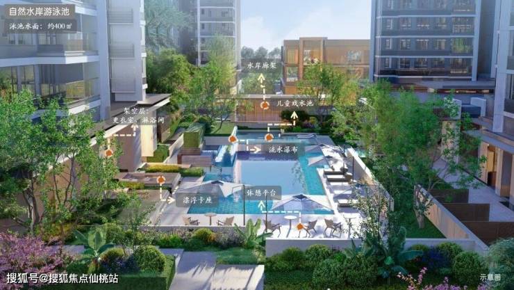 【自然水岸游泳池】:约400㎡无界亲子多元互动型泳池