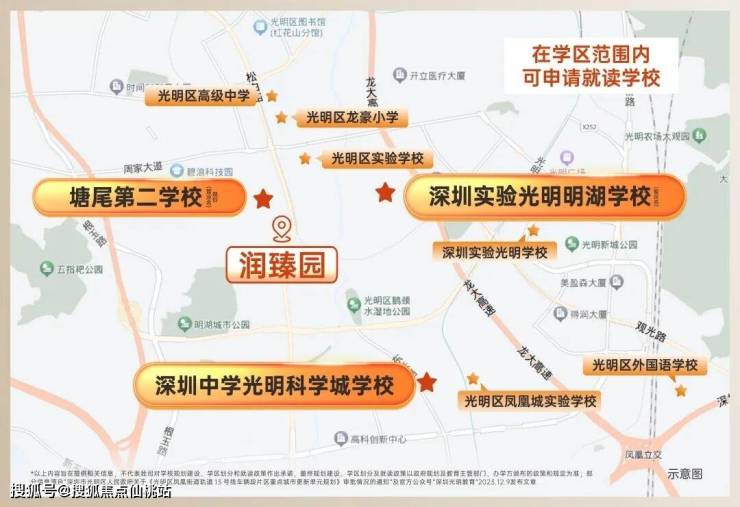 优质教育:社区内配置幼儿园,西北侧地块为九年一贯制学校(规划中),与项目一路之隔。大城规划3所九年一贯制学校、其中一期学校深圳实验光明明湖学校2025年9月已开学(信息源自深圳光明学校公众号),项目3公里范围内涵盖深圳中学光明科学城学校、深圳市光明实验学校等。