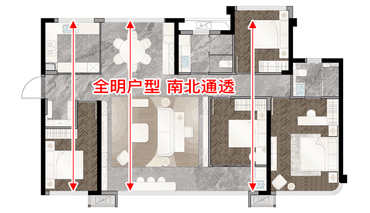 南北通透的设计,客厅、主卧、次卧三个开间全部朝南而铺,令整间房子顿时通透明亮。无论你和家人在客厅看电视,还是卧室小憩,都可享受到充沛的阳光和新鲜空气。