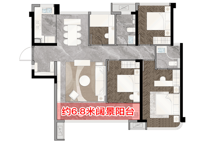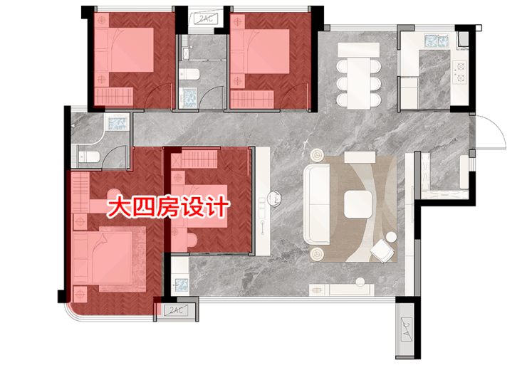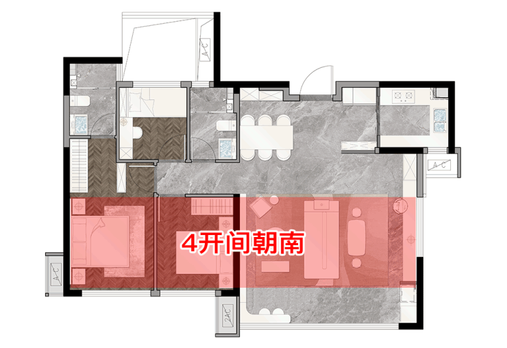 在三胎时代,四房大势所趋。建发丨缦云建面约128㎡四房两厅两卫,既满足三代同堂的需求,又可给予每位家人足够的私密生活空间,满足多样化居住需求。