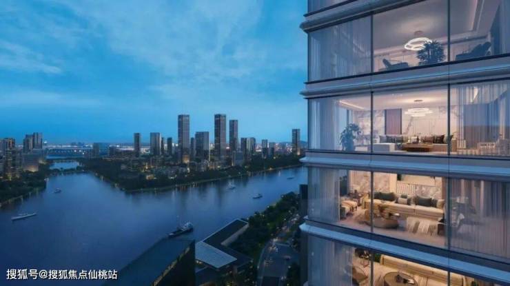 在建筑造型上,融合岭南骑楼形态与曼哈顿第五大道520号的细节设计灵感,勾勒出典雅大气的三江环幕地标。塔顶设计致敬经典的白天鹅酒店,以 45° 倒三角形状构建出极具辨识度的“城市天际线符号” 。首层抬高约14米,缔造低层私密化体验,并以90%窗墙比、超270°景观视野,实现对稀缺珠江生态资源的独家收藏。