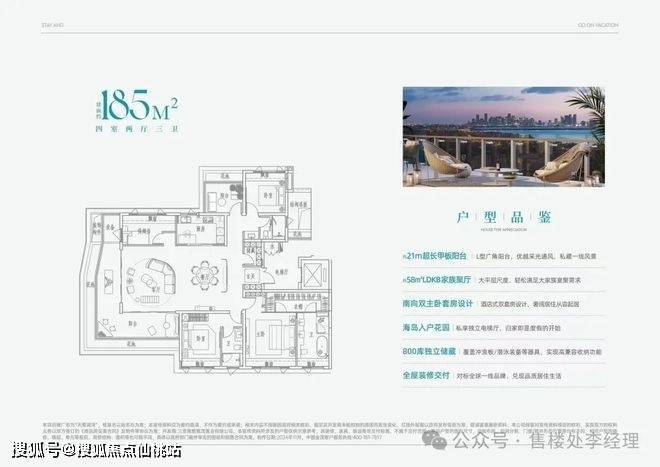 185㎡户型约 21m 超长甲板阳台,约 58m²LDKB 家族聚厅,满足大家族宴聚需求。