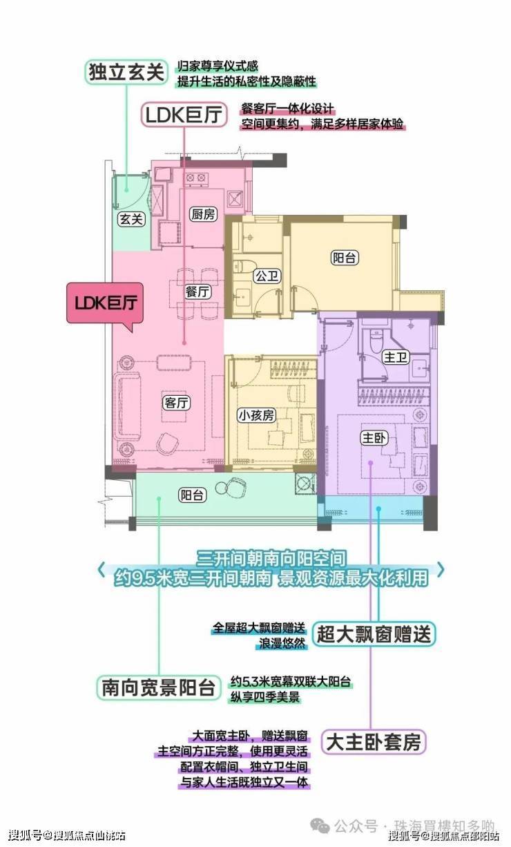 独立玄关+LDKB多空间联动+三开间朝南+南向大阳台+全屋飘窗赠送+尊崇主卧套间