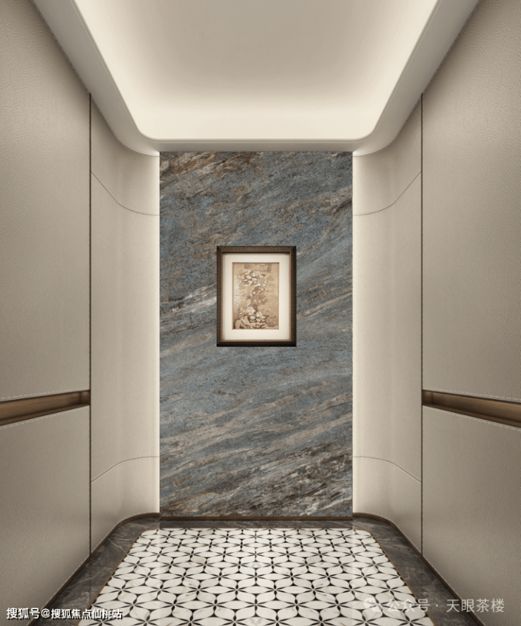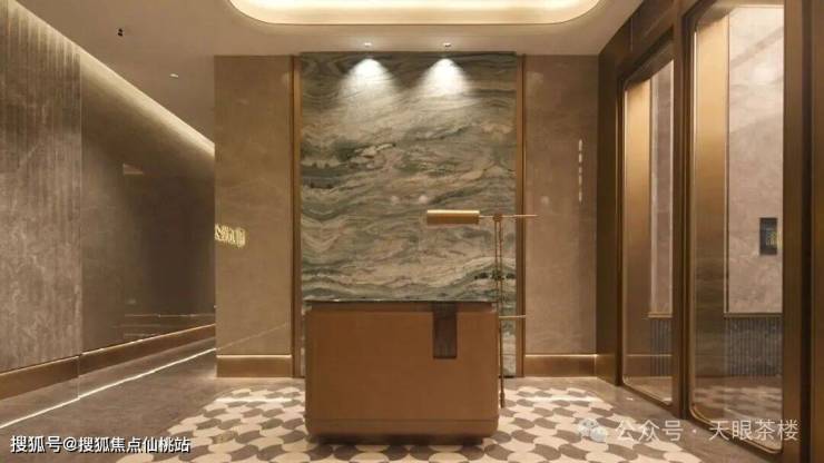 一进入户大门,就看到管家服务台,未来能提供钻石管家服务。拼花地砖、奢石背景墙、棕金框水波纹玻璃屏风,天鹅绒艺术漆吊顶与雕花电梯门,对标五星级酒店式大堂。