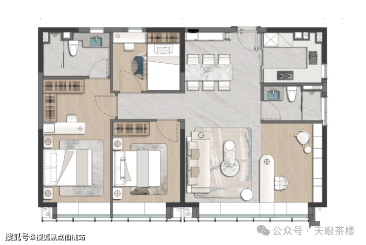 124平南向户型:可设计为4房或三卧朝南,配备约6米社交横厅