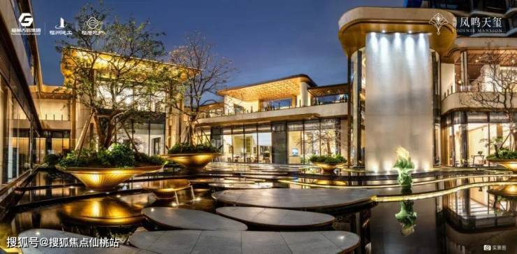 55米宽的凤凰门,以7米高之姿巍然矗立。门扉采用透光云石与巴西潘多拉奢石镶嵌,单方造价逾两万;辅以30万“凤鸣九天”铜雕与流水喷泉,动静相宜。两侧香樟与蓝花楹夹道迎候,归家之路,每一步皆浸润于非凡的仪式感之中。