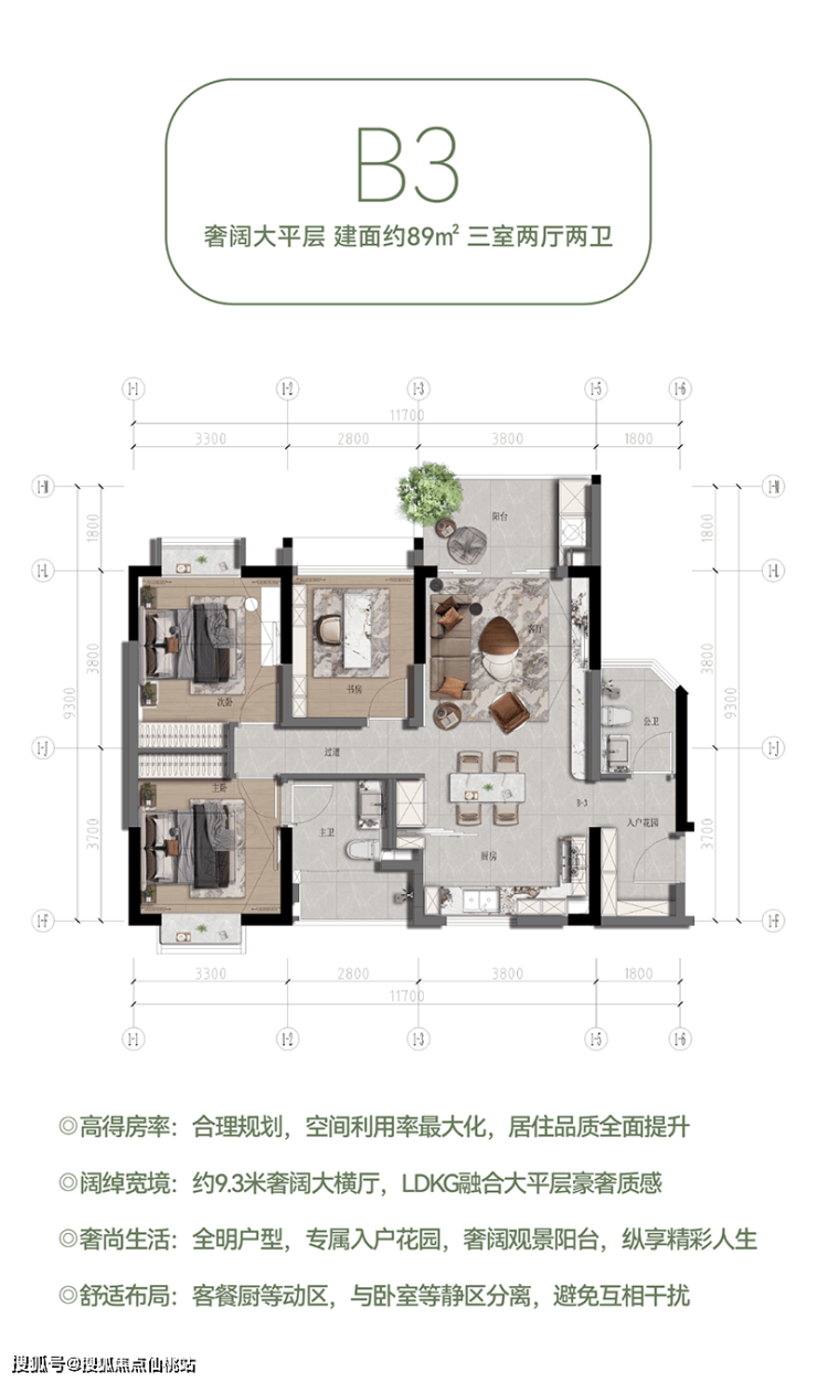 具体来说,A-2户型(建面约60㎡)以独立入户花园和客餐厨一体化设计,打造宜居范本;B-2户型(建面约84㎡)则通过通透宽厅和观景阳台,让阳光清风入室做伴;B3奢阔大平层(建面约89㎡)以高得房率和阔绰宽境,提升居住品质;A-2+B-2大平层(建面约142㎡)则通过豪宅质感和私密有序的设计,满足家庭成员的多元需求;而B-3+B-3空中微墅(建面约178㎡)更是以人性规划和品质宜居的设计理念,打造出一处尊贵的居住空间。
