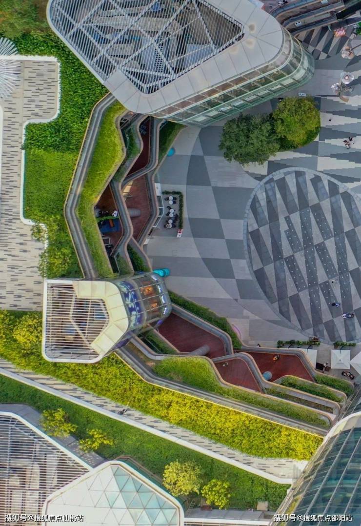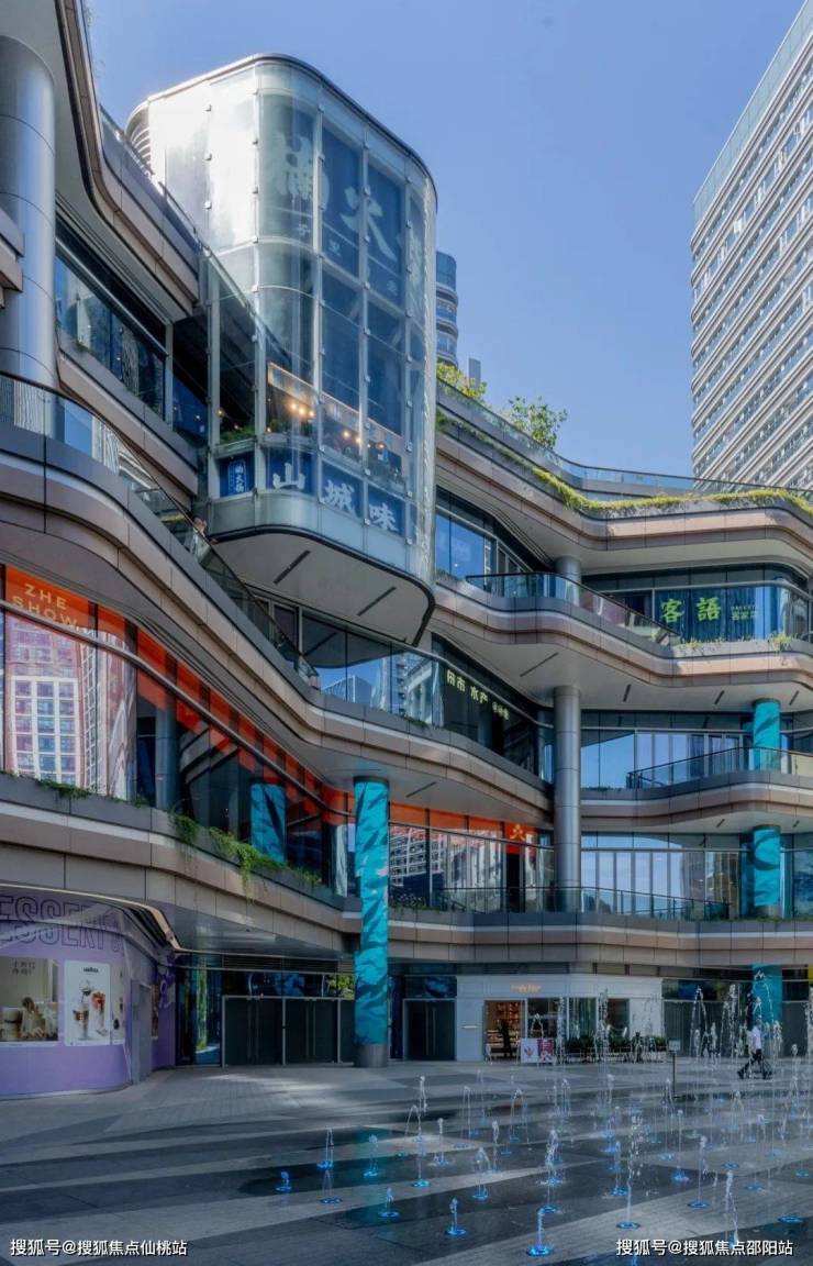 中心区域设置的“无界广场”, 通过绿化、水景、广场等元素与各方穿越的人流连接。同时,与商场的外铺及外摆区域形成较好的互动关系。退台和屋顶创造了大量可供休憩的休闲场地,大量与城市互动的公共空间,促进了人与自然的交流,也满足了购物中心举办各类活动的需求。