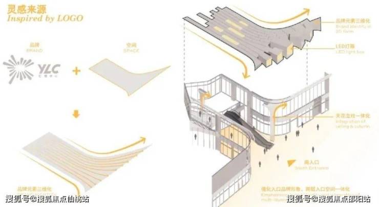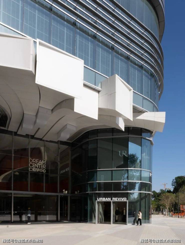 位于西南角的商业主入口为城市创造了一个关口,邀请人们进入购物中心,并与北侧的周边环境相连接。设计团队巧妙地将“梦中心”品牌的标志性元素以三维立体形式融入建筑设计,呈现出颇具识别性的入口造型,强化品牌形象。