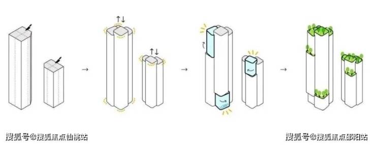 项目所在更新单元由8个地块组成,本项目位于西南角,由A、B座产业研发用房塔楼,C、D座宿舍塔楼,五层商业附楼,三层地下室组成。