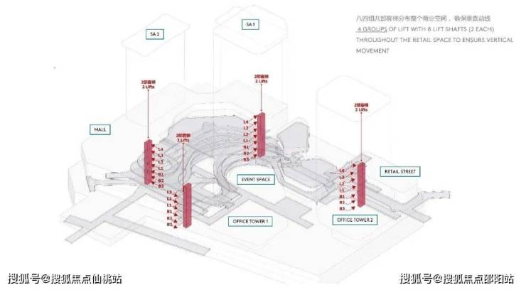 商业地下一层西北角与地铁链接,通过内部中庭及街区引导人流向各个商业角落及其他地块,在首层设置城市公共通道从地块南侧横跨至北侧,在三层设置空中连廊与相邻地块连通。单元内各地块、地铁、公交站形成联动,增加趣味性及商业价值。