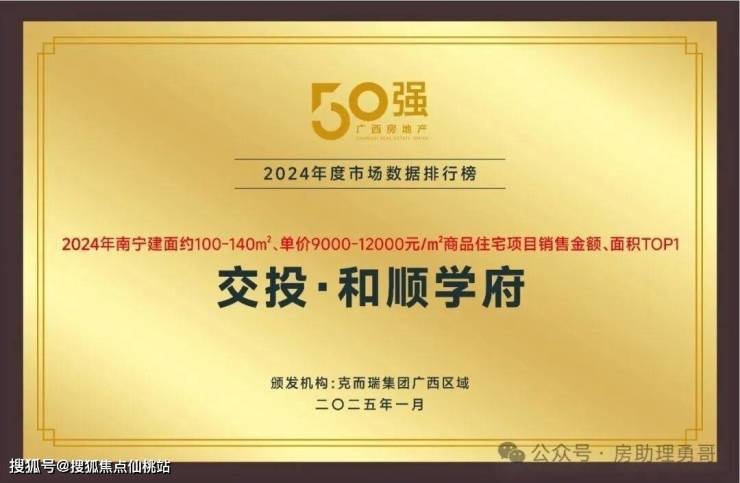 2024年,凭借其精湛的施工工艺、创新的设计理念和完美的工程质量,项目荣获南宁市建设工程质量安全协会、广西工程建设质量安全管理协会授予的三项建设工程大奖、2024年南宁建面约100-140㎡、单价9000-12000元/㎡商品住宅项目销售金额、面积TOP1等奖项。