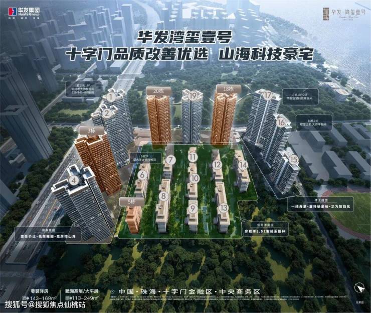 项目整体包含10栋8-10F低密洋房、7栋阔景山海高层、3栋瞰海大平层,共20栋楼。是琴澳滨海CBD最后一块可开发的纯住宅用地,产品为建面113-246㎡四至五房产品,均为高品质精装修交付