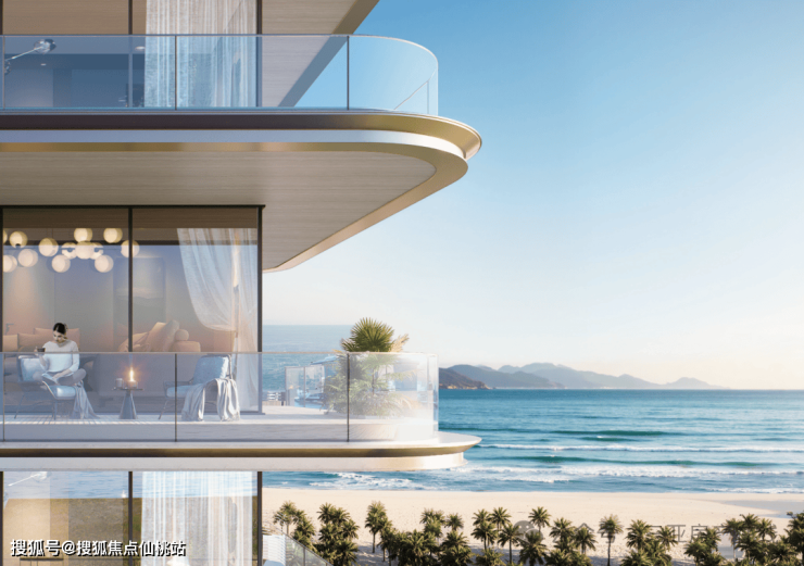 建筑以“超流体立面”呼应海浪肌理,通过悬挑阳台、底层架空消解建筑与水岸的边界,搭配 270° 观景阳台、云端泳池、环形瞰海露台等设计,让河景、海景与生活空间深度交融,成就“外揽海之豪迈,内藏河之幽静”的谧境岛居。