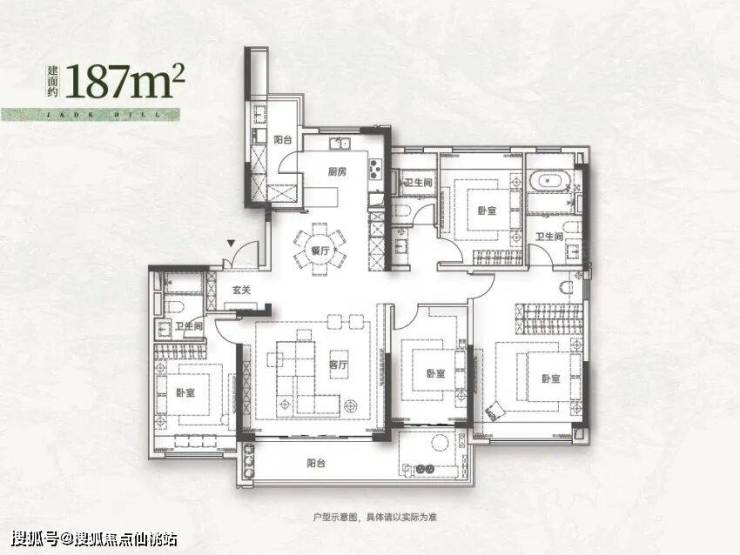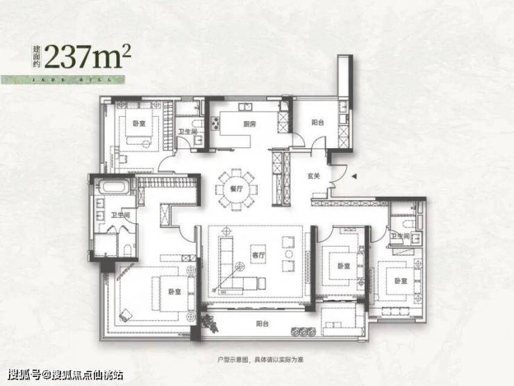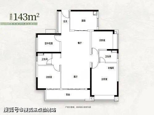 改善主力:建面约 143㎡ 四房两厅两卫,四开间朝南,7.6 米南向双联观景阳台,主卧带独立步入式衣帽间与卫浴,适配一步到位的改善客群。