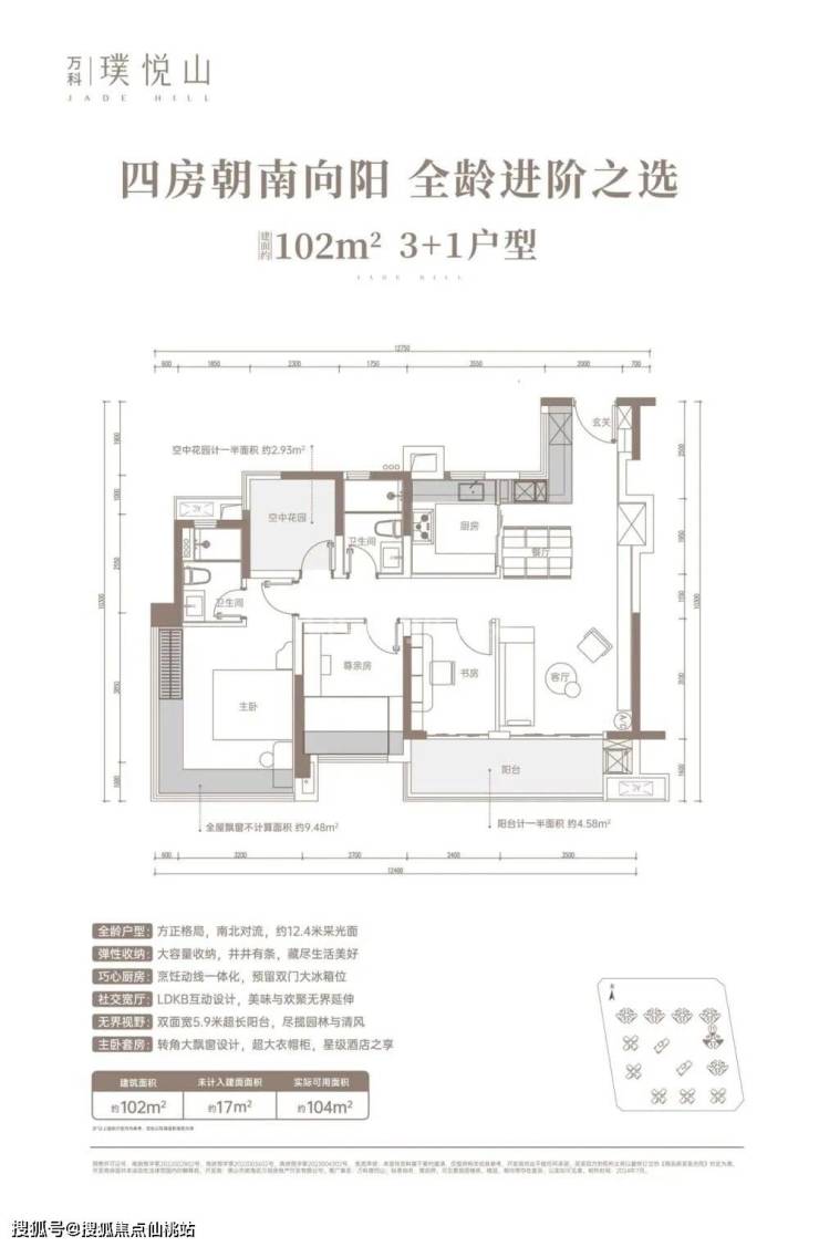 刚改主力:建面约 102㎡ 3+1 房两厅两卫,LDKB 一体化大方厅设计,5.9 米宽厅,南北双阳台对流,空间利用率拉满,适配二胎家庭、三代同堂的全周期居住需求。