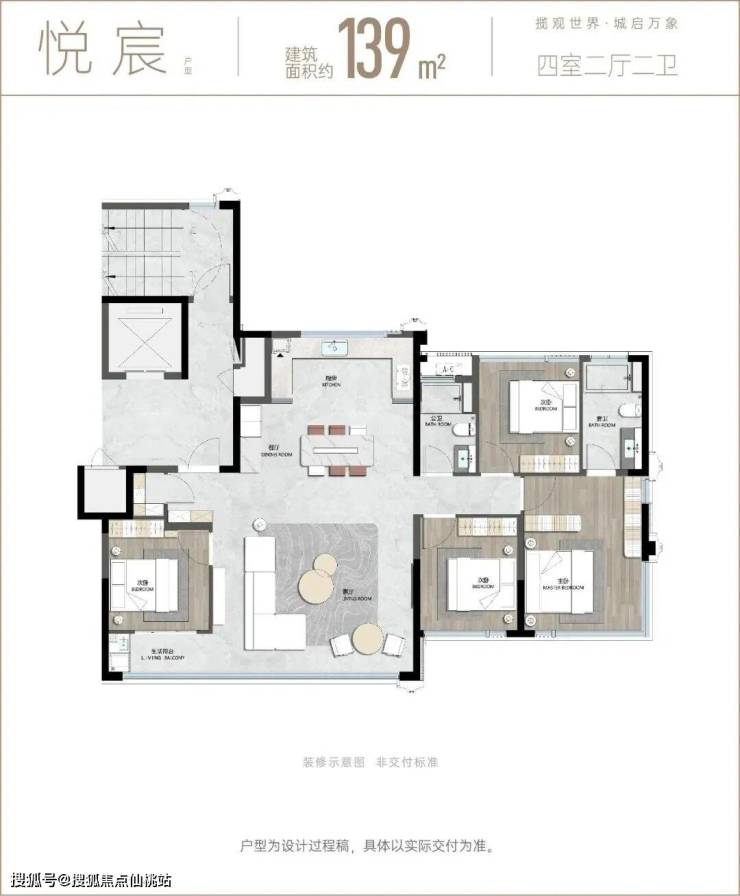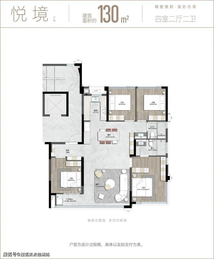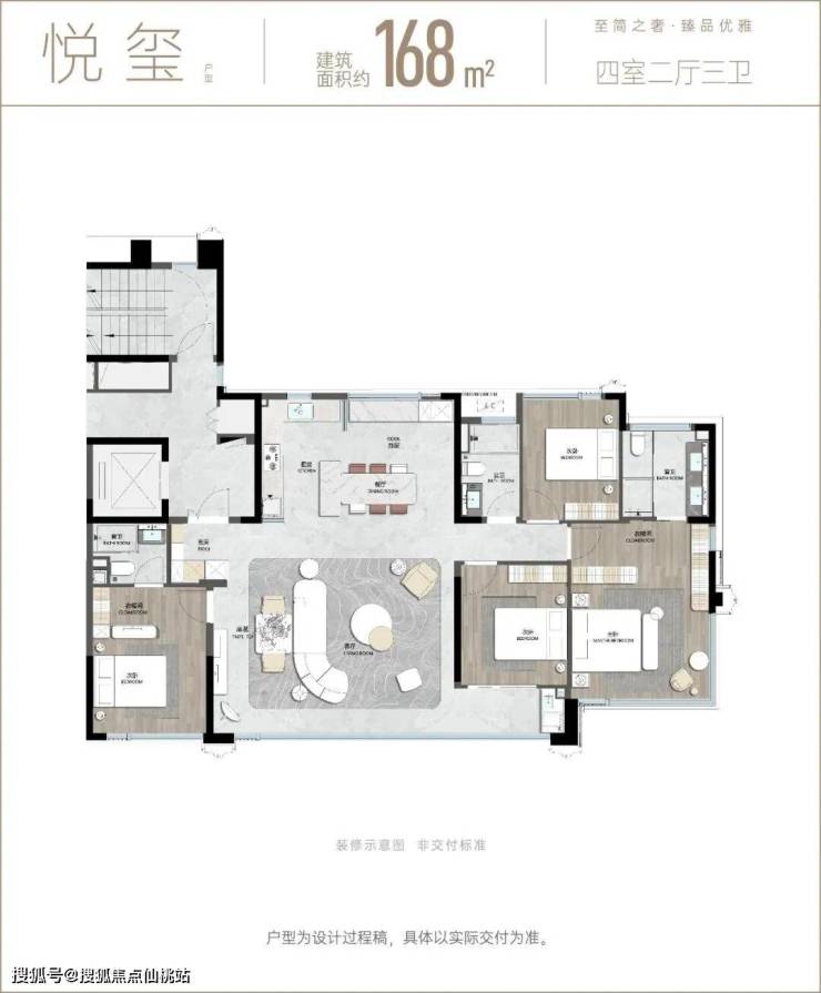 其中168㎡户型采用双主卧套房设计,配备独立电梯厅,私密性与舒适性兼具。