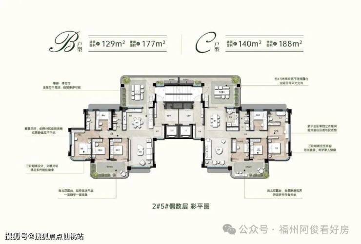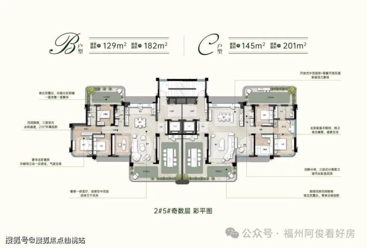 约 129㎡ 主力阔景四房南北双空中庭院,餐客厨一体化大方厅,使用面积最高