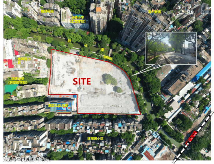项目整体坐北朝南,项目南侧是配建的24班华侨小学;东侧和北侧被驷马涌河岸线环绕形成玉带环腰之势;项目总用地面积约1.7万㎡,总建筑面积约2.2万㎡,容积率约3.5,项目有三个出入口,项目北面是正门人行主出入口,项目南面是车行入口和车行出口,小区内人车分流,动静结合。设计理念是广府style,岭南新韵,展现老城独有的生活张力,融合岭南广府文化,通过现代设计手法焕发传统元素新貌。