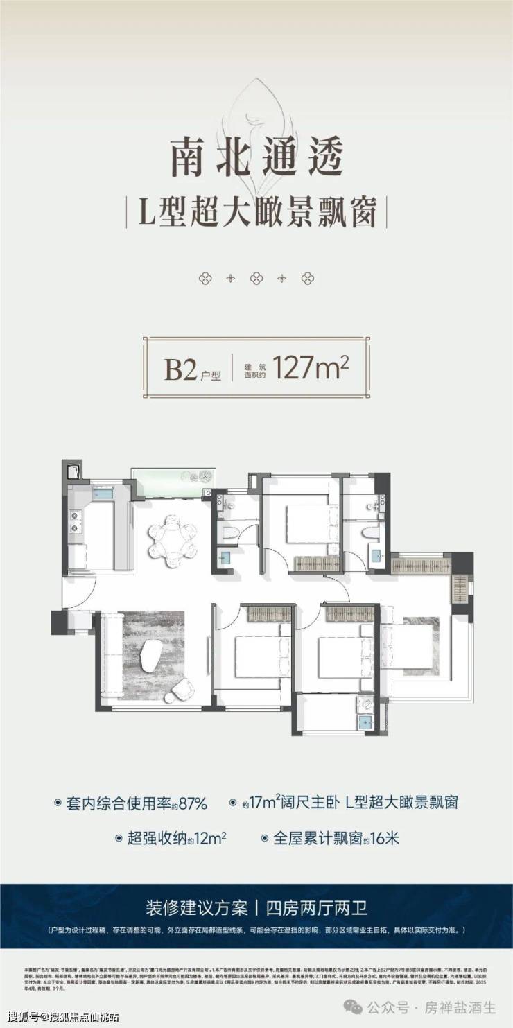 - 建面约127㎡户型:四房户型,双阳台设计,得房率89%,空间宽敞。