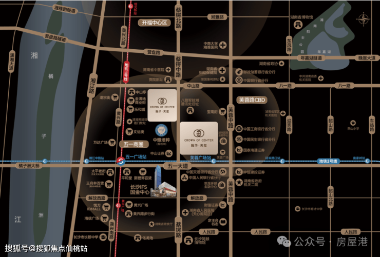 项目位于正市中心,五一广场与芙蓉广场之间,距离地铁1号线五一广场站约600米、2号线芙蓉广场站约700米,尽享五一广场、芙蓉广场周边成熟配套。教育方面,未来预计配套入读中雅培粹品牌九年制学校。(学区划分,学校引入品牌事宜,以正式文件为准)