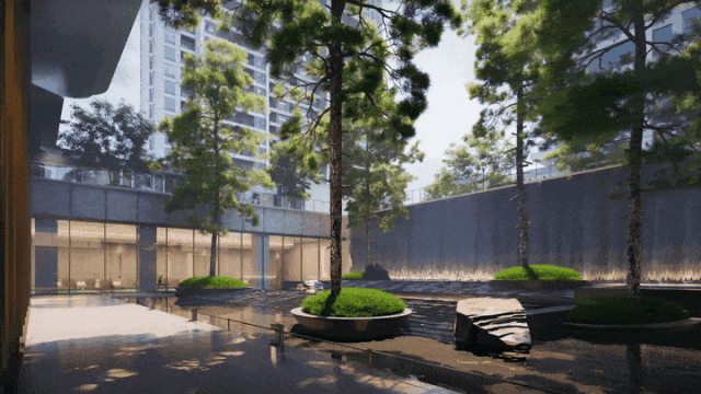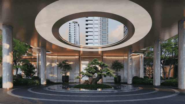 经迎宾松院进入社区,中央对景选用特选造型松延伸纵向景观,一座圆弧形的天井映入,晴时斜阳光影错落,雨时水滴顺沿而下,泗水归堂,阔池劲松,慢看云起云舒。方寸之间,却有无限意境,内心渐被触动,人也逐渐松弛下来。
