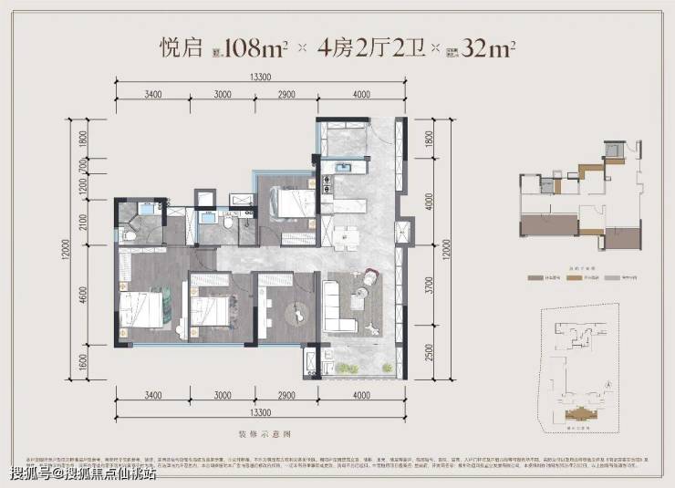 入门级建面约108㎡四房户型,四开间朝南向,动静科学分区,创新的S墙提升收纳,入户处有一个弹性空间,拓展功能多样。约4米宽客厅衔接约1.6米进深阳台,主卧套房约3.4米开间,公卫都有六个平方。市面上的108㎡客厅开间仅约3.6米,虽也能4房2卫,但主卧很少能做到这个尺度,有些为了空间甚至省去了晾晒功能。