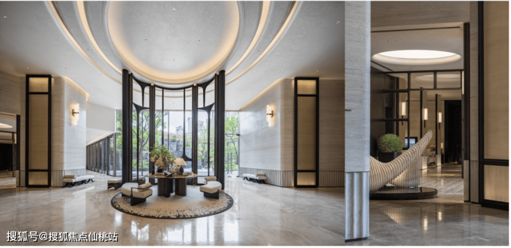 会所整体用材运用石材、木饰面、陶瓷等元素,还原材料本身的触感以及自然的舒适度,来打造东方典雅的空间。同时通过材质的延伸,呼应与建筑景观的一体性。