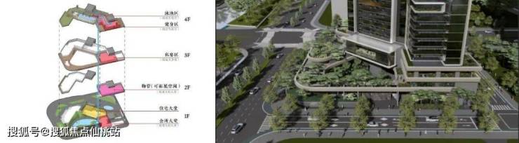 规划上采用超级底盘的形式,将公建配套叠在4层以下,将住宅放置在5层以上,同时通过连廊和屋顶将不同楼层的配套联系起来,形成了立体游园动线;平面上通过塔楼将庭院分为前庭和后院,前庭设置环岛落客区,后院置入山水景观实现业主休闲需求。