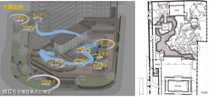 【十景山水立体游园】景观设计借用连廊、屋顶等空间,结合归家动线和休闲动线,打造立体游园,在园林中置入山水节点。