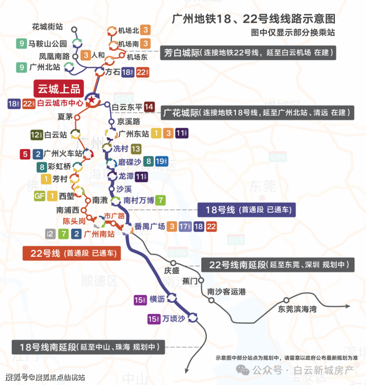 22号线:广州枢纽交通专列 ,三站白云机场(机场东站)、两站棠溪TOD(白云站)、三站火车站(广州火车站)、十站南站(广州南站)。
