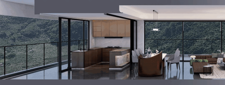 项目并没有浪费得天独厚的山林湖海视野,任意一套大平层单位,均配置三边环绕式阳台,你能透过玻璃窗框,欣赏IMAX环幕景观。