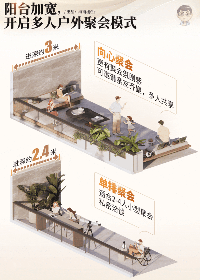 2.4米进深的阳台,只能让业主并肩而坐,3米进深的阳台,却能形成一个向心空间,让更多亲友相聚户外,获得围炉而坐的绝佳体验。